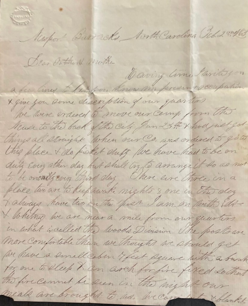 Having time, I write you a few lines to let you know my present occupation & give you some description of our quarters. We were ordered to move our camp from the Neuse to the back of the city January 24th & had just got things all straight when our company was ordered to go to this place & do picket duty. We have had to be on duty every other day but shall try to arrange it so as not to be on only every third day. There are three in a place; two are to keep awake nights and one in the day & alsys have two on the post. I am on with Eds. & Whitney. We are near a mile from our quarters in what is called the Woods Division. The posts are more comfortable than we thought we should get. We have a small cabin 7 feet square with a bunk for one to sleep & an arch for fire fixed so that the fire cannot be seen in the night. Our meals are brought to us. We carry [ ] & blankets from camp. We can sit on a good seat where it is warm & dry & do our duty. We like it far better than we did at Newbern.