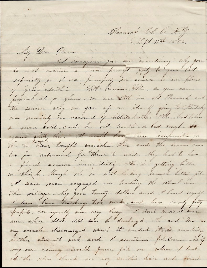 I imagine you are “wondering” why you do not receive a more prompt reply to your last—especially as it was principally in answer to our plan of “going South.” Well, Cousin Peter, as you can perceive at a glance, we are still in old Claverack and the reason why we gave up our idea of going to Kentucky was mainly on account of Addie’s health. She had taken a severe cold and her old trouble—a bad cough—is again with her. It would have been impossible for her to teach anywhere then and the season was too far advanced for them to wait. They had to have a final answer immediately. She is getting better we think though she is not looking much better yet.