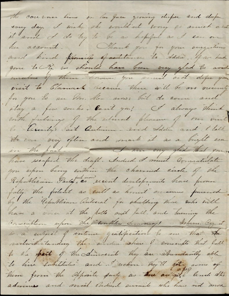 I am very glad that you have escaped the draft. Indeed, I must congratulate you upon being within the charmed circle of the Republican Party just now as recent developments have proven fully, the potent as well as “honest” measures pursued by the “Republican Autocrat” for shielding those who will have a voice at the polls next fall and turning the conscription upon the worthless democracy. However, coz., it is a subject of intense gratification to me that notwithstanding the undue share of conscripts that fall to the part of the Democrats, they are abundantly able to hire “substitutes” and I reckon they’ll get some of them from the opposite party as there are yet a few of Uncle Abe’s admirers and most obedient servants who have not more of the “green” currency than they know what to do with. But perhaps you are like some of the gentlemen that I know; “you do not like to hear a lady talk politics.” If no, pardon me and I will change the subject. Nonetheless, “them’s my sentiments.”