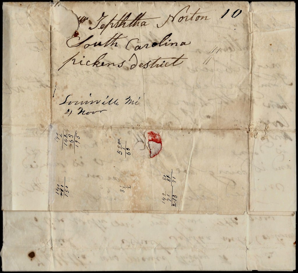 Stampless letter addressed to Jeptha Norton, South Carolina, Pickens District