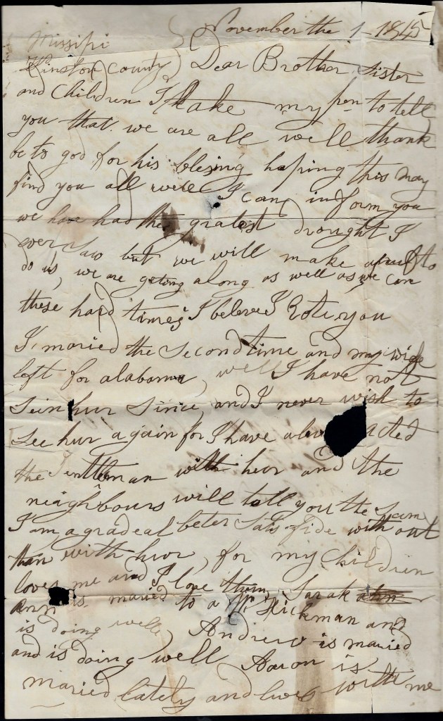 I take my pen to tell you that we are all well, thanks be to God for His blessing, hoping this may find you all well. I can inform you we have had the greatest drought I ever saw but we will make enough to do us. We are getting along as well as we can these hard times. I believe I wrote you I married the second time and my wife left for Alabama. Well I have not seen her since and I never wish to see her again for I have always acted the gentleman with her and the neighbors will tell you the same. I am a great deal better satisfied without than with her for my children loves me and I love them. Sarah Ann is married to a W. Hickman and is doing well. Andrew is married and is doing well. Aaron is married lately and lives with me.