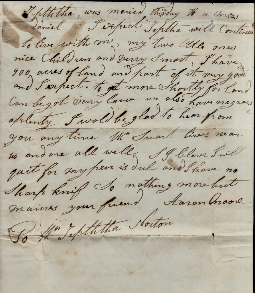 Jeptha was married Thursday to a Miss Daniel. I expect Jeptha will continue to live with me. My two little ones are nice children and very smart. I have 900 acres of land and part of it very good and I expect to get more shortly for land can be got very low. We also have negroes aplenty. I would be glad to hear from you anytime. W. Smart lives near us and are all well. I believe I will quit for my pen is dull and I have no sharp knife so nothing more but remain your friend, — Aaron Moore
