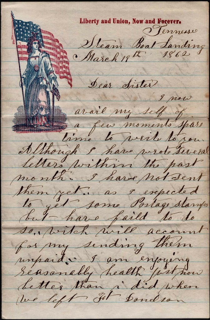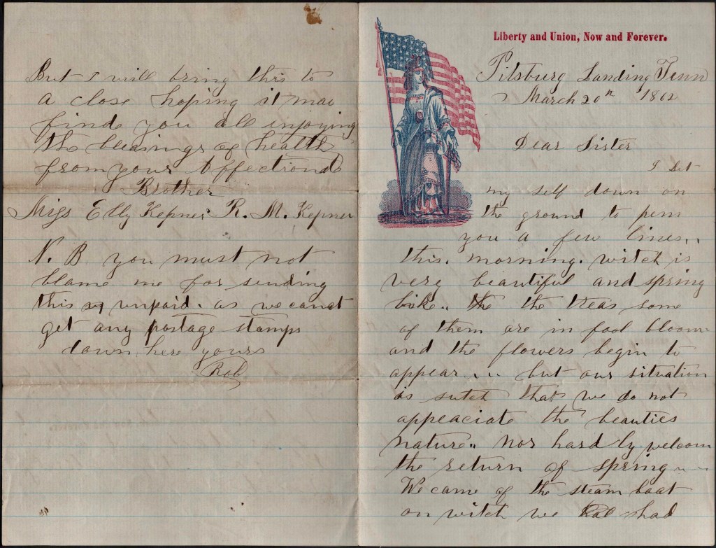 I sit myself down on the ground to pen you a few lines this morning which is very beautiful and spring-like. The trees—some of them—are in full bloom and the flowers begin to appear. But our situation is such that we do not appreciate the beauties of nature nor hardly welcome the return of spring. We came off the steamboat on which we had been living for the past week yesterday and are encamped on a high bluff on the bank of the river. It is a very pleasant place and reminds me very much of the bluffs of Indiana.