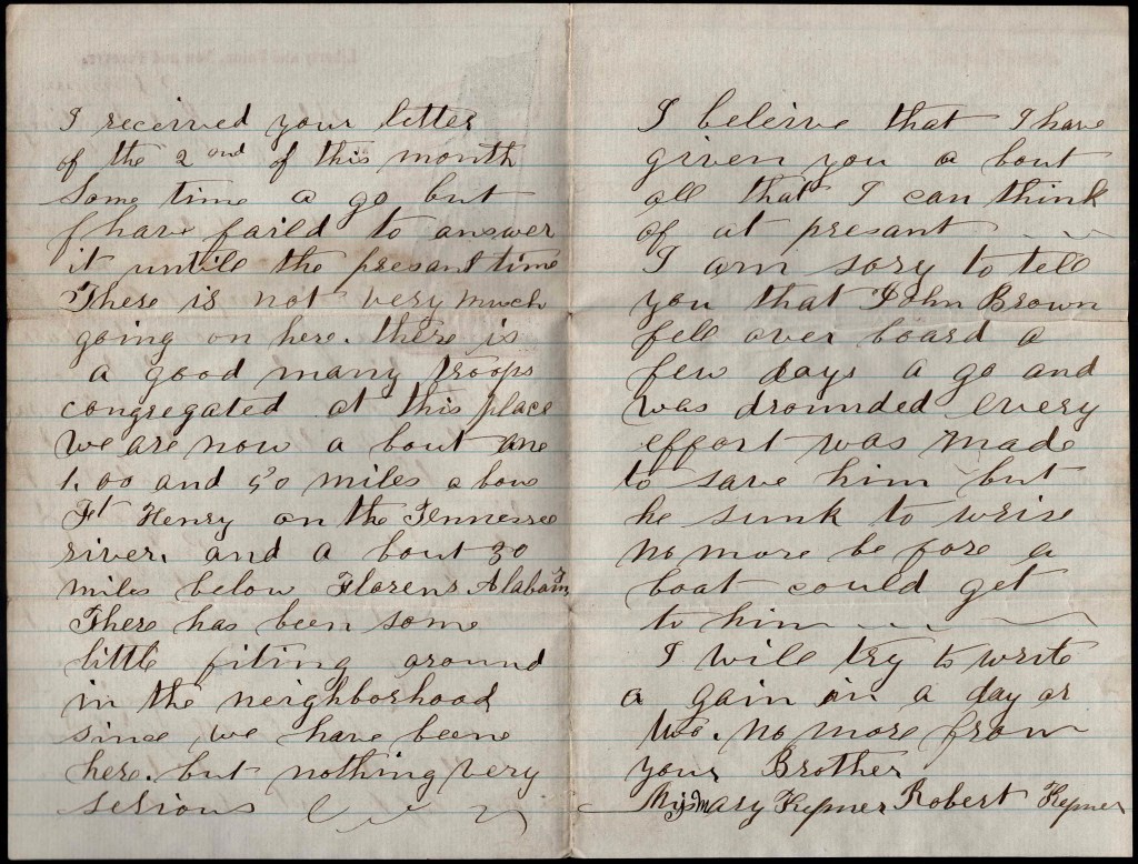 There has been some fighting around in the neighborhood since we have been here but nothing very serious. I believe that I have given you about all that I can think of at present. I am sorry to tell you that John Brown fell overboard a few days ago and was drowned. Every effort was made to save him but he sunk to rise no more before a boat could get to him.