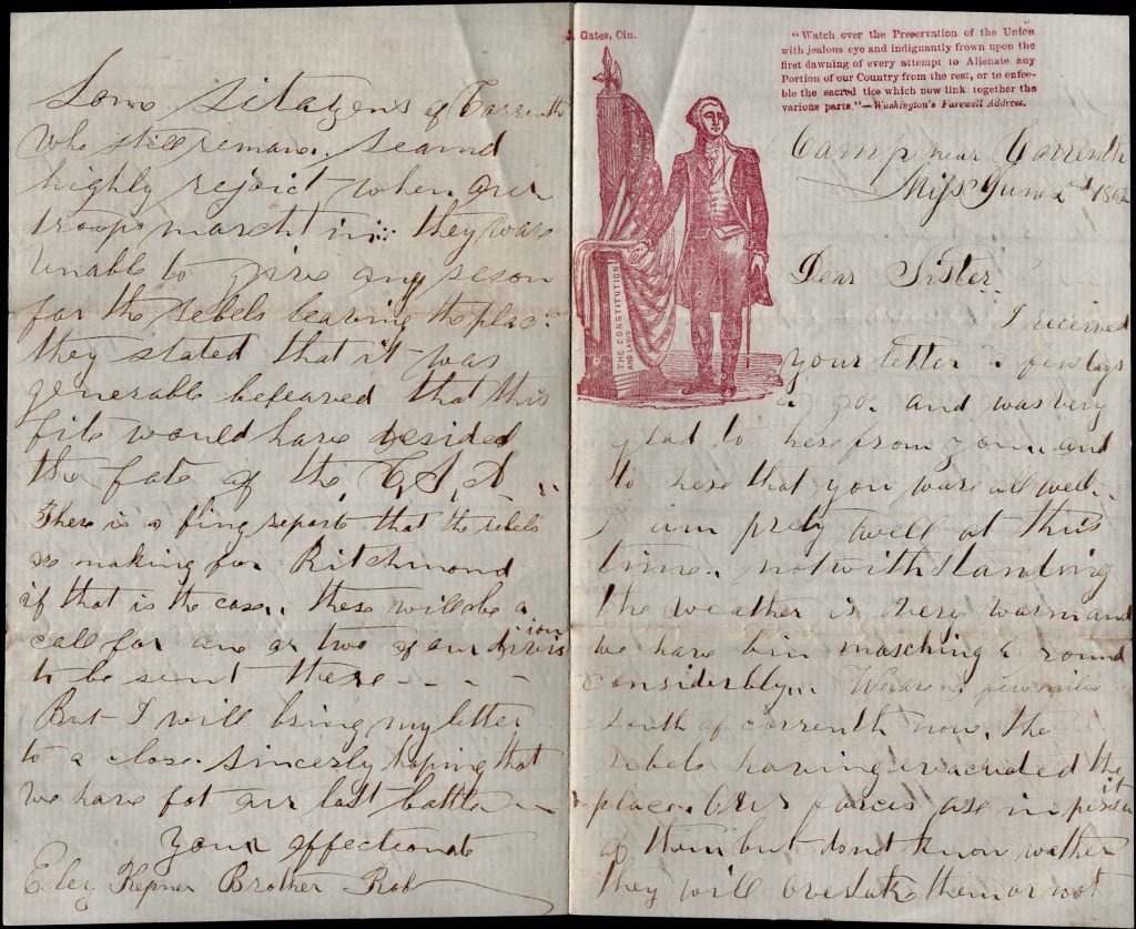 These letters were written by Robert (“Rob”) M. Kepner (1838-1929), the son of Samuel Kepner (1811-1862) and Elizabeth Haslet (1815-1845) of Marengo, Iowa. Rob was “a young Iowa farm boy when he enlisted in Co. G of the 7th Iowa Infantry. On October 4th [1862], the second day of the Battle of Corinth, the regiment was fighting near Battery Powell. With the regiments on either side of them retreating, the 7th held their ground until ordered to fall back and the brigade reformed around them. Sometime during the desperate fighting Robert was shot in the face. Robert kept up an active correspondence with his younger sister but he always avoided the gory details that might frighten her. When he mentioned his wound he as often as not made light of it. He broke the news by telling her, “I have got a slight introduction to something less than a pound of Sesech lead in the face. I was struck by a miney (sic) ball in the left cheek just above the mouth—the ball striking the bone and glancing, lodged in the back part of the cheek, making rather an ugly, though not very painful wound. I am doing finely, and you need not feel the least uneasiness about me.”