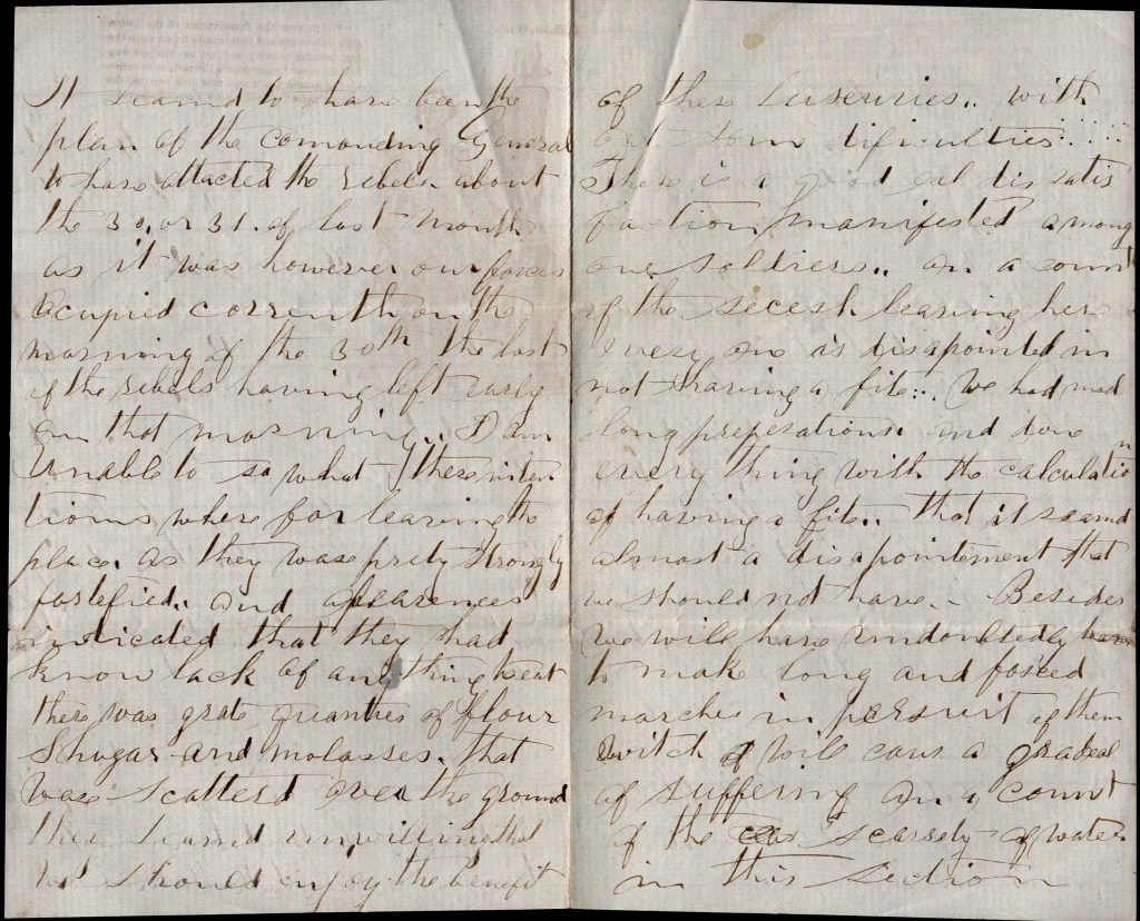 I do not know as I can think of much more to write as it is about the same thing over with us except the different scenes in the country that we travel over, and there is not anything in them either to interest or amuse. The inhabitants mostly all leave their homes as we approach and every thing that is of any use to the soldier is then carried off or destroyed leaving the country entirely waste.