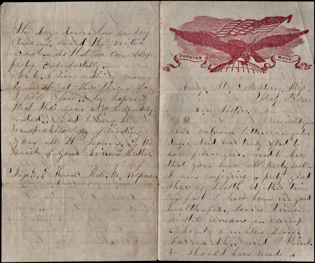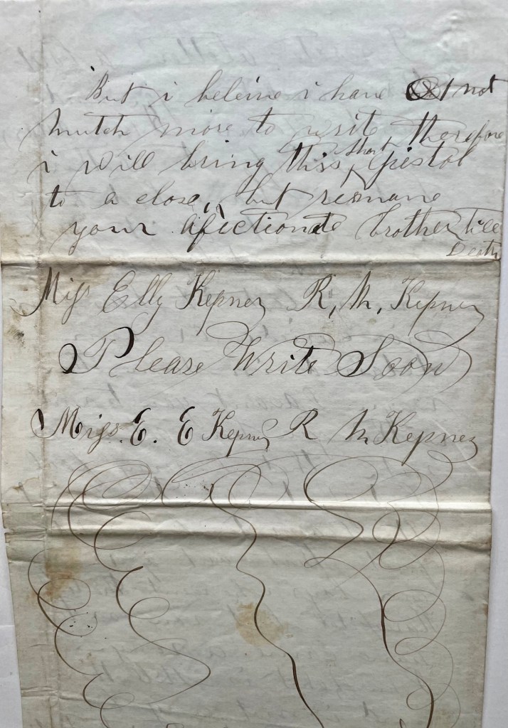 But I believe I have not much more to write. Therefore, I will bring this short epistle to a close but remain your affectionate brother till death. — R. M. Kepner to Miss E. E. Kepner