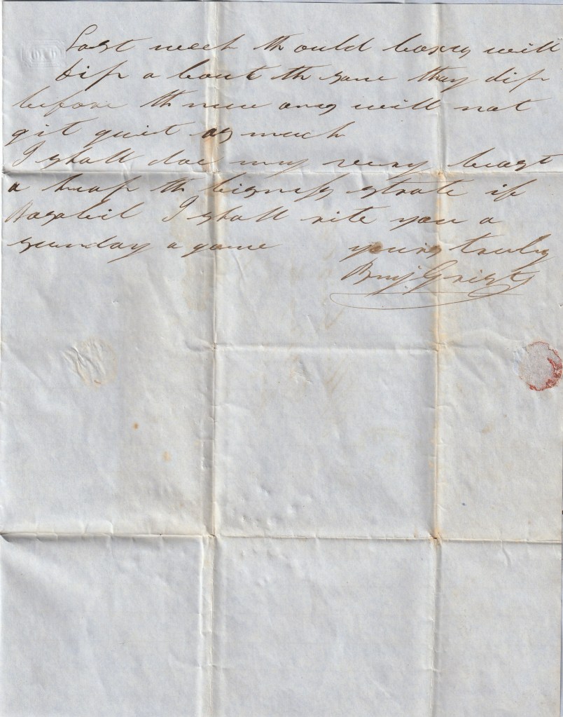 This is an 1851 stampless folded letter (SFL) from Benjamin Grist, a barely literate slave overseer in rural southeastern North Carolina to his cousin, Allen Grist, a very wealthy (and much more educated) businessman and slaveowner (owning more than 100 slaves) then in Wilmington N. C. Benjamin writes his “cuzen”, (who was also the owner of the plantation on which Benjamin worked), to provide an update on his trials and tribulations in overseeing Allen’s vast ‘turpentine’ plantation (a major business in that part of NC at the time). Much of the letter deals with problems with some of the slaves, including running away and then having to be ‘punished’ after being caught and returned, e.g. ”I give tham 40 [lashes] a peas [apiece].”
