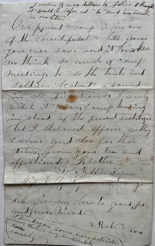 Rob wrote some of his letters to his sister, Ellen Elizabeth Kepner (1842-1923) who would later (1866) marry James Henry Mead of Marengo, Iowa. Mead served in Co. E, 24th Iowa Infantry during the Civil War. It should be noted that Rob had a brother named Daniel S. Kepner (1840-1862) who was killed in action at Antietam while serving in Co. A, 14th Indiana Infantry. It should also be noted that though all the records I have found on Rob show his name to be Robert, for some reason he signed his named “Robbin” on this letter.