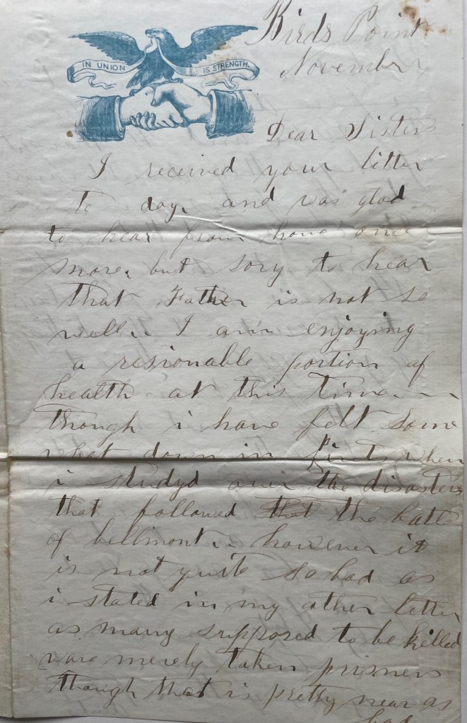 I received your letter today and was glad to hear from home once more but sorry to hear that Father is not so well. I am enjoying a reasonable portion of health at this time though I have felt somewhat down in spirits when I studied over the disaster that followed the Battle of Belmont. 1 However, it is not quite so bad as I stated in my other letter as many supposed to be killed were merely taken prisoners though that is pretty near as bad.