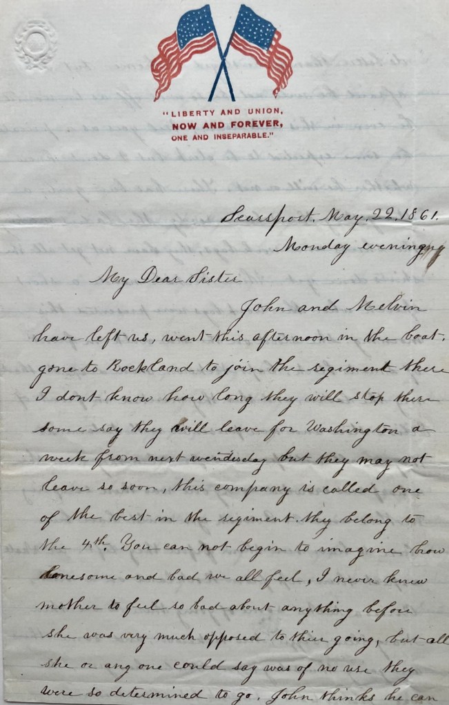 On patriotic stationery bearing the mantra “Liberty and Union, Now and Forever, One and inseparable,” 21 year-old Eveline Maria Wiswell (1840-1922) penned the following letter from Searsport, Waldo county, Maine to one of her sisters. Eveline was the daughter of Joseph Warren Wiswell (1806-1890) and Martha True (1800-1888). In her letter, datelined 22 May 1861, Eveline describes the departure of two brothers to serve in Company I, 4th Maine Infantry. They were Joseph “Melvin” Wiswell (1842-1921) and John Baker Wiswell (1838-1909).