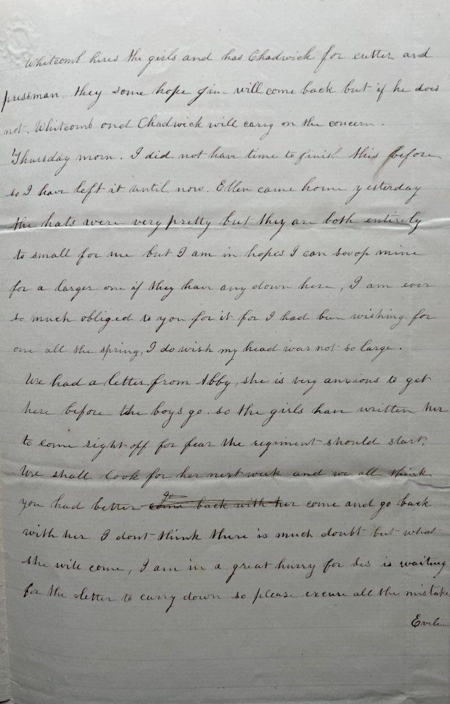 We had a letter from [sister] Abby. She is very anxious to get here before the boys go, so the girls have written her to come right off for fear the regiment should start. We shall look for her next week and we all think you had better come and go back with her. I don’t think there is much doubt but what she will come. I am in a great hurry for sis is waiting for the letter to carry down so please excuse all the mistakes. — Eveline