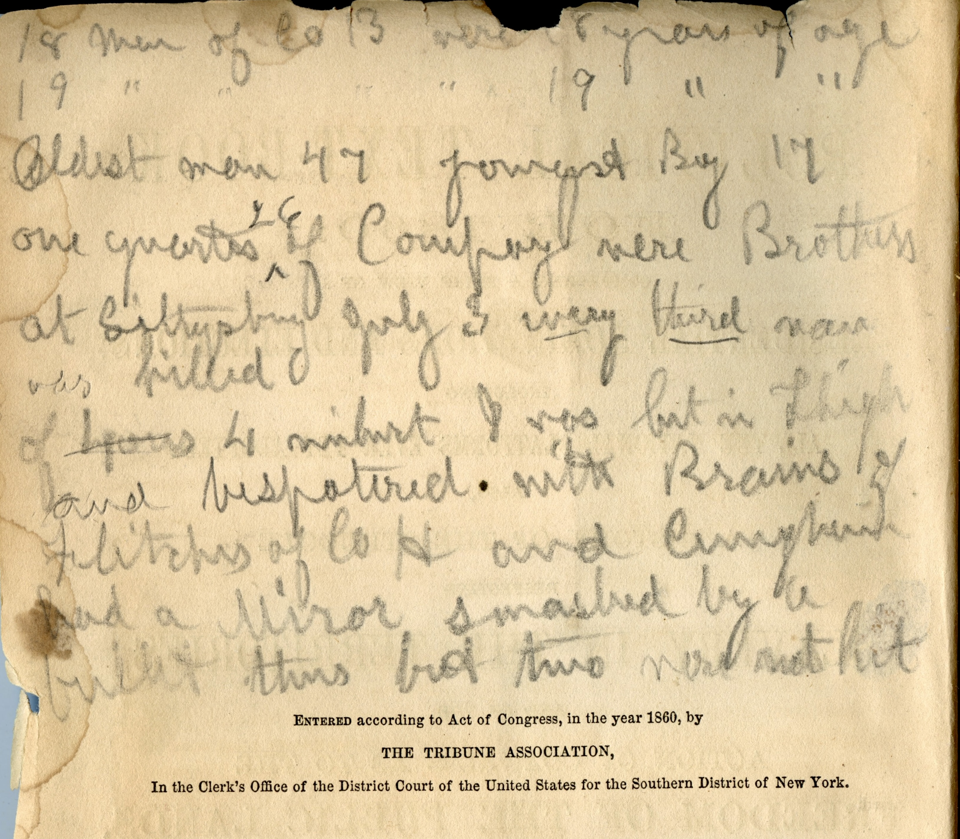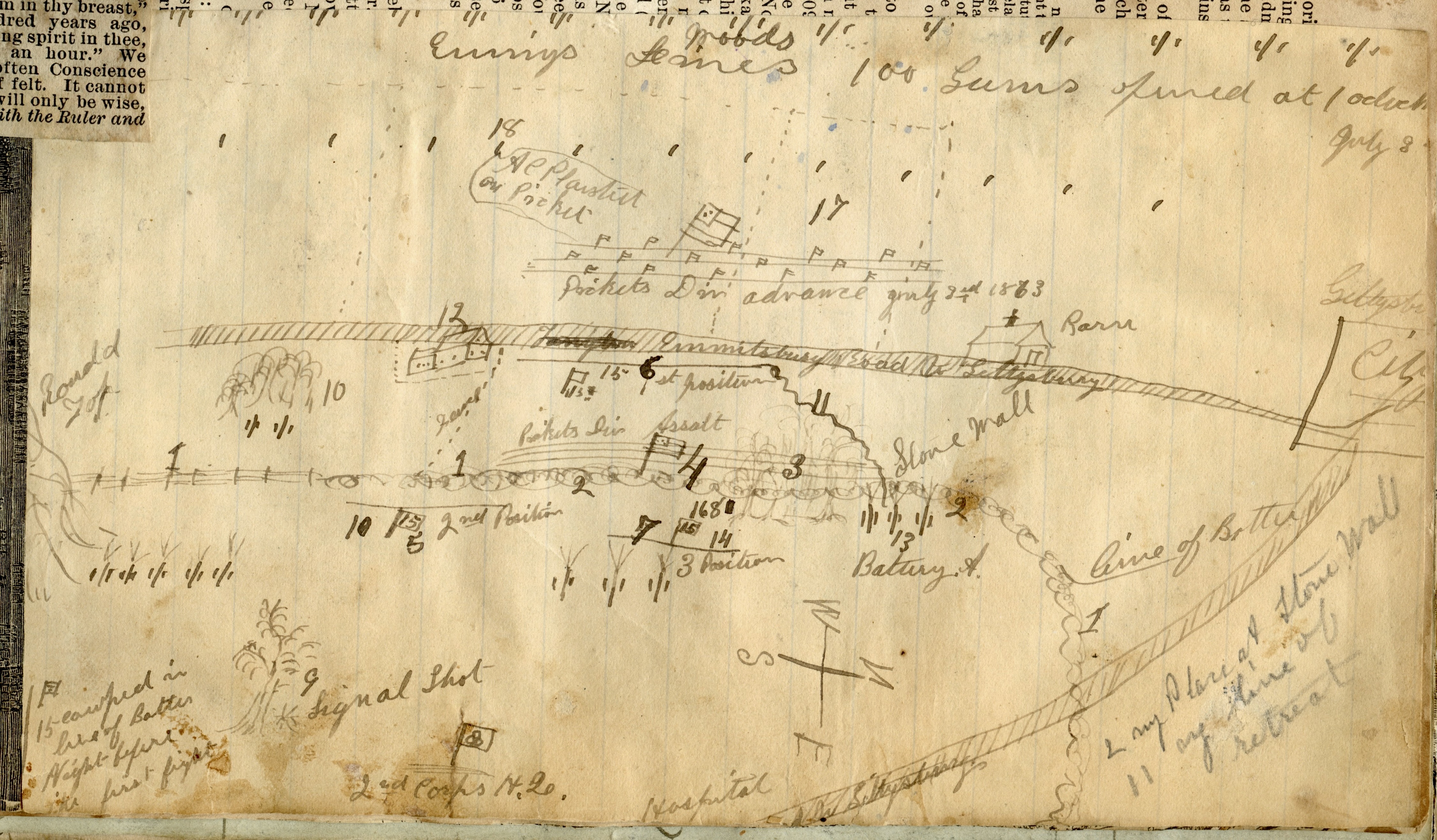 Gettysburg. After the fight we were four men for duty out of 22. Eleven were taken prisoner July 2nd when we fell back from the Brick [Codori] House through Battery A. My face was burned by powder and some of the regiment was killed by our own guns. They fired on many when we were all mixed up together.