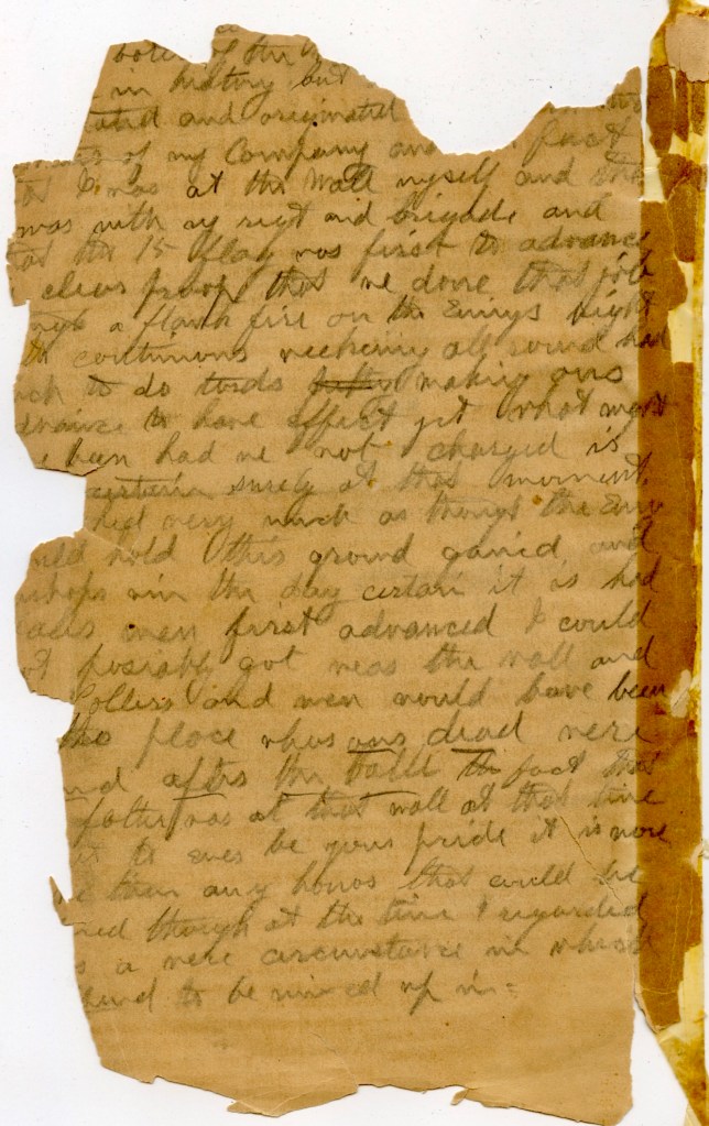 Our Brigade was not over 1,000 and the 15th [Massachusetts] flag was the first to advance though Gen. [Norman J.] Hall called out as we started for the wall, “Forward, that there color!” I thought it was one of his regiments and history gives to credit [writing illegible] which is false …of my company and in fact [ ] that I was at the wall myself and that [ ] was with my regiment and brigade and that the 15th [Mass.] flag was first to advance is clear proof that we done that job through a flank fire on the enemy’s right. The continuous [weakening?] all round had much to do towards making our advance to have effect. Yet what must have been had we not charged is uncertain. Surely at that moment it looked very much as though the enemy would hold this ground gained and perhaps win the day.